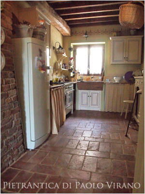 La cucina è stata pavimentata interamente con tavelle di recupero rosse.